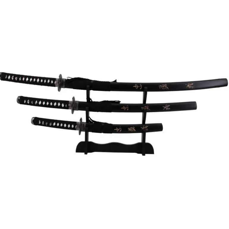 Es una réplica de un set de Katana, Wakisashi y Tanto. La Katana es de 100 cm, el Wakisashi de 77 cm y el Tanto de 52 cm, las hojas son de acero.