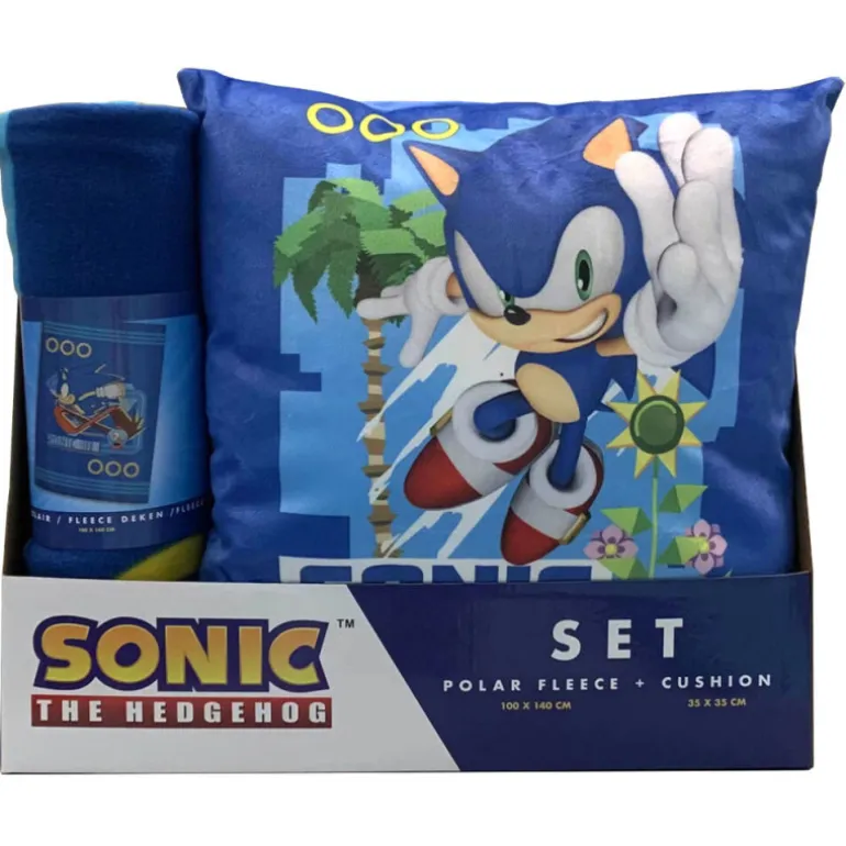 El set manta y cojín Sonic es el regalo perfecto para todos los fans del popular personaje de videojuegos. Este set incluye una manta polar de alta calidad con un diseño vibrante de Sonic the Hedgehog y un cojín a juego.