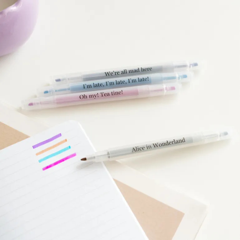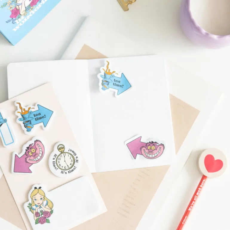 Las dos hojas de pegatinas y el bolígrafo personalizado con goma de borrar completan este set de papelería, garantizando que cada vez que se utilice, se recuerde la magia y la fantasía de Alicia en el País de las Maravillas.