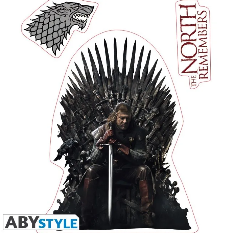 Mira que cosa más chula!! O mejor, que COSAS más chulas por que es un set de pegatinas que vale por dos!! Por un lado un pack de pegatinas homenaje a la casa Stark de Juego de Tronos, con el elegante Ned Stark sentado en el Trono de Hierro y que podrás complementar con el lobo huargo de los Stark y la frase The North Remembers (el Norte Recuerda).
