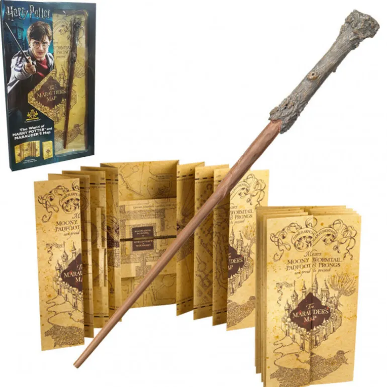 Un conjunto de réplicas, a escala real, diseñadas y fabricadas por la prestigiosa firma de réplicas de cine The Noble Collection, con una cantidad de detalles realmente espectacular y unos acabados de gran calidad, como es habitual en esta casa. Tanto la varita de Harry, como el Mapa del Merodeador son completamente fieles a los que hemos visto en las películas, y además vienen los dos juntos en un envase diseñado especialmente para este pack.