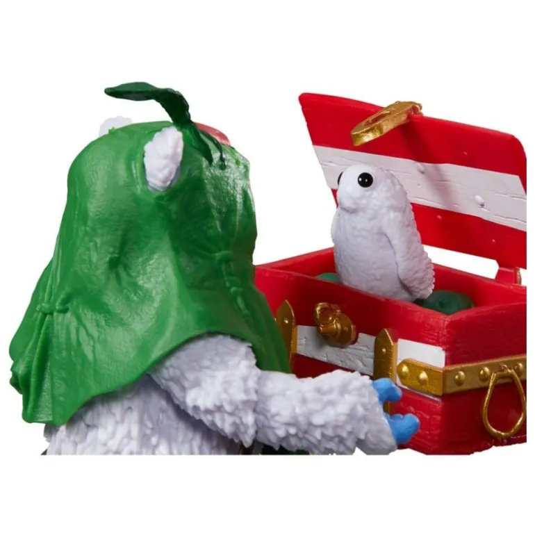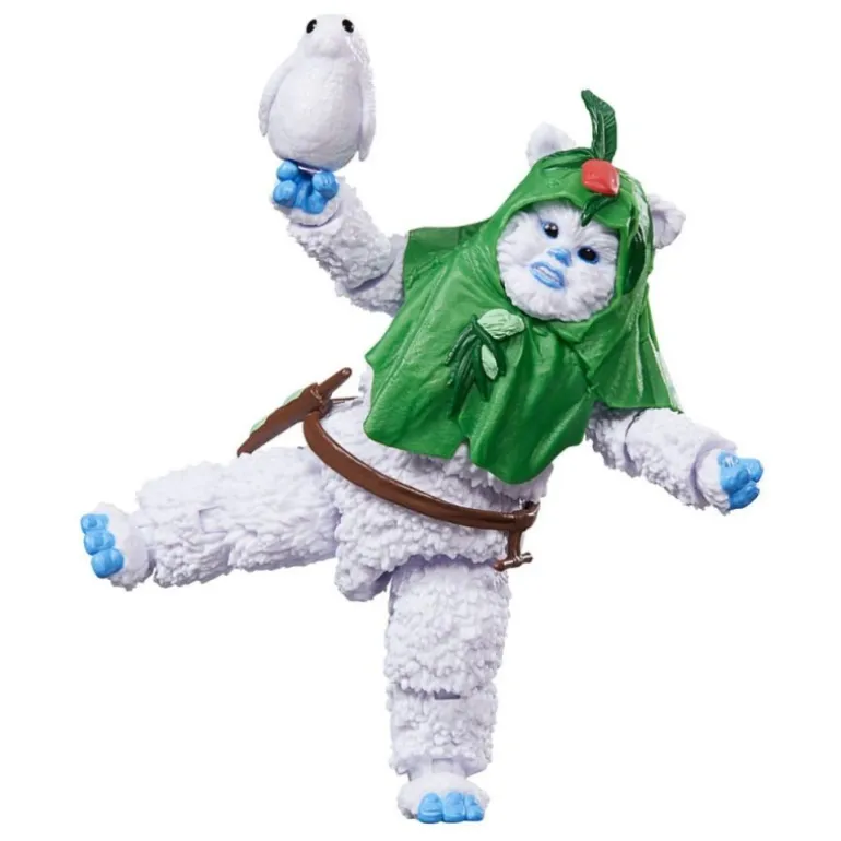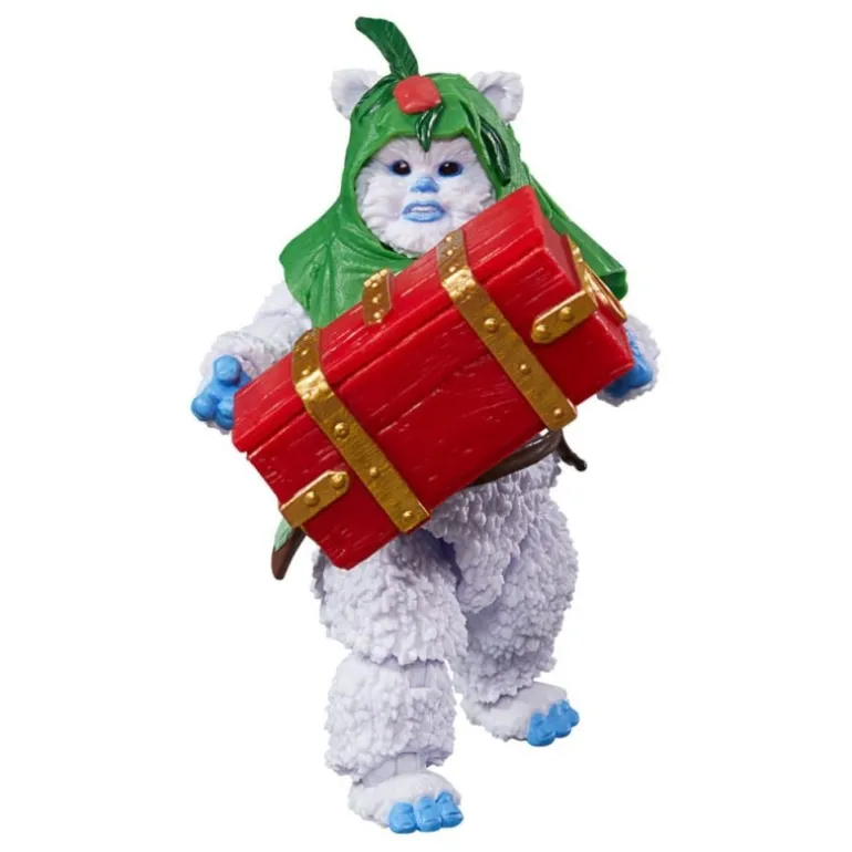 La figura muestra al ewok vestido con un atuendo invernal, compuesto por una capa verde decorada con un acento rojo, perfecto para celebrar la temporada festiva. Sus adorables detalles, como las manos y pies azules, y el pequeño animal blanco que lo acompaña, añaden un toque extra de encanto y singularidad. Además, el ewok sostiene un bastón decorado, aportando un aire distintivo y auténtico.