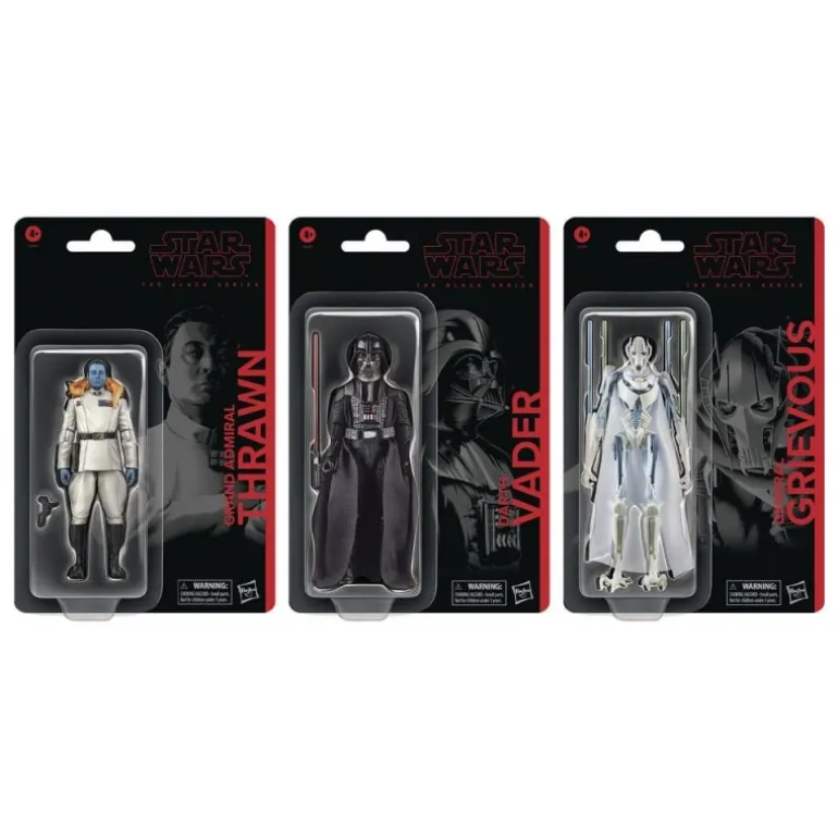 Este impresionante pack de la serie Star Wars The Black Series incluye tres figuras de acción de 15 cm: Darth Vader, gran almirante Thrawn y general Grievous. Cada figura está diseñada con detalles precisos que permiten recrear escenas memorables del universo de Star Wars, desde los cómics hasta las películas y series. Fabricadas por Hasbro, estas figuras son un regalo ideal para coleccionistas y fans de la saga.