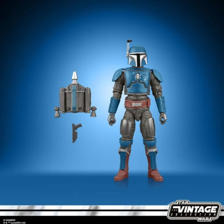 Incluye una figura articulada de Mandalorian Privateer de 10 cm, equipada con armadura en tonos azul y gris, y accesorios que mejoran su autenticidad. El diseño del guerrero mandaloriano es fiel a su representación en la serie, destacando su casco detallado y su cinturón con accesorios adicionales.