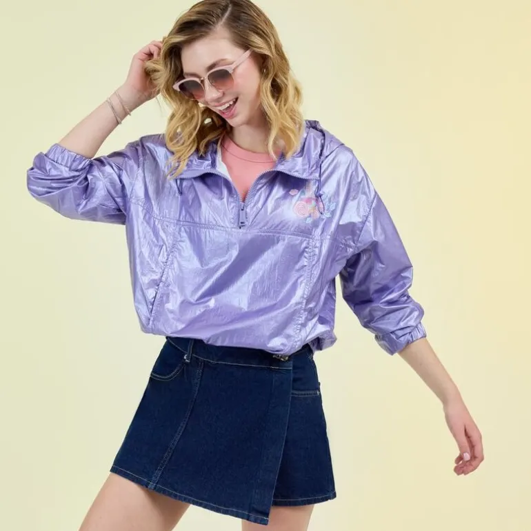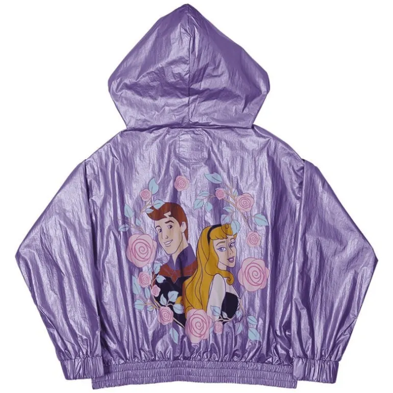 Descubre la sudadera cortaviento con un encantador diseño de Princesa Aurora y Príncipe Phillip de Loungefly. Este producto con licencia oficial Disney es perfecto para los amantes de los cuentos de hadas. Confeccionada en un tono lila brillante, esta sudadera presenta un detallado estampado en la parte posterior donde los personajes están rodeados de rosas. Además, posee un pequeño dibujo del castillo de cuento en el frente. Su material ligero y de calidad es ideal para usar en días de viento, combinando estilo y funcionalidad.