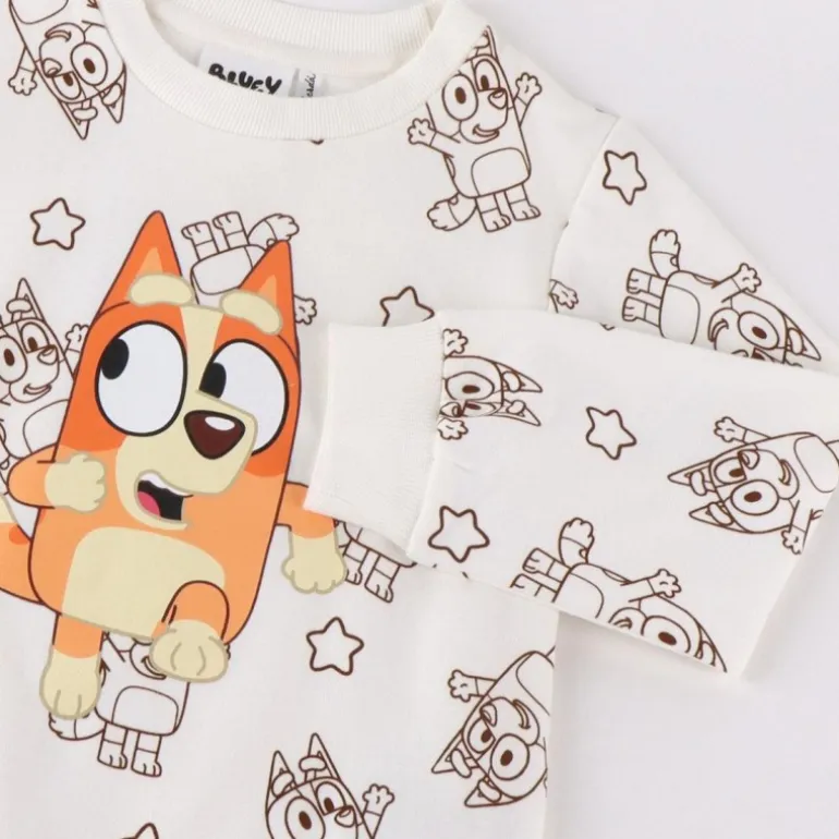 El diseño presenta un fondo blanco con un patrón repetido de Bluey, el personaje favorito de muchos niños, en un tono marrón claro. Destaca la gran imagen de Bluey en el centro, resaltando su adorable carisma. Los puños y el cuello están acanalados para un mejor ajuste y mayor confort.