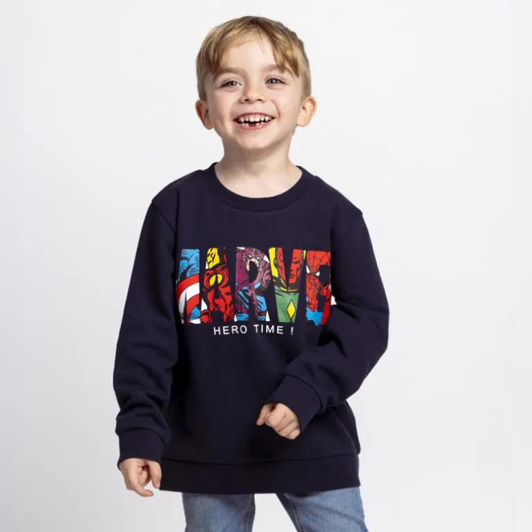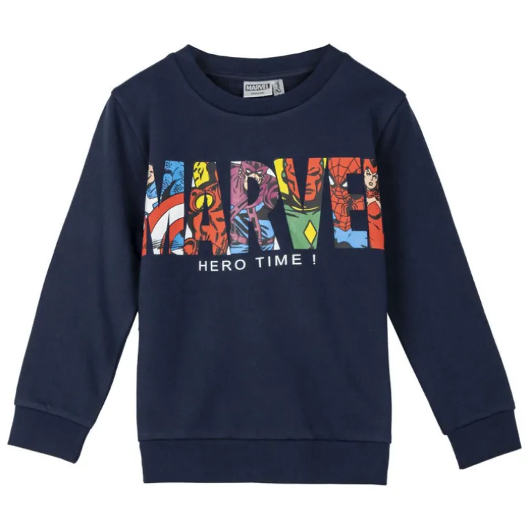 Descubre la sudadera perfecta para los pequeños héroes de la casa. Esta sudadera de Marvel presenta un diseño en color azul marino con un llamativo estampado en el pecho que combina los colores del universo Marvel, con personajes icónicos integrados en el texto «MARVEL» y el texto «HERO TIME!».