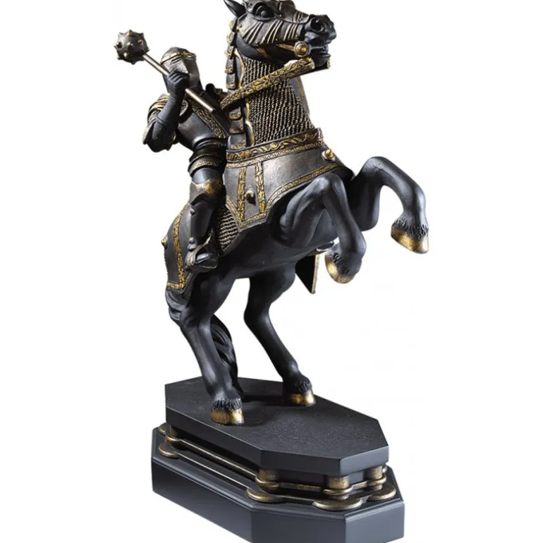 Se trata de una espectacular figura que mide unos 20 cm aproximadamente, y representa con total fidelidad y gran cantidad de detalles al Caballero Negro, una de las piezas más hermosas del mítico Ajedrez Mágico (Wizard Chess, en su versión original). Una figura diseñada y fabricada por la prestigiosa firma especializada en réplicas The Noble Collection, que podrás usar como sujetalibros o bien exponerla donde más te guste porque es una maravilla. Tiene unos acabados realmente conseguidos y está pintada al detalle primorosamente.