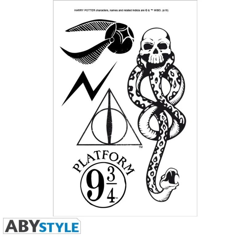 Descubre el set de tatuajes de Harry Potter, un imprescindible para los verdaderos fans de la saga. Este pack incluye cinco hojas de diseño exclusivo, cada una de 15×10 cm, con los íconos más reconocidos del universo mágico. Desde la clásica plataforma 9 3/4 hasta el símbolo de las Reliquias de la Muerte, cada tatuaje está diseñado con gran detalle.