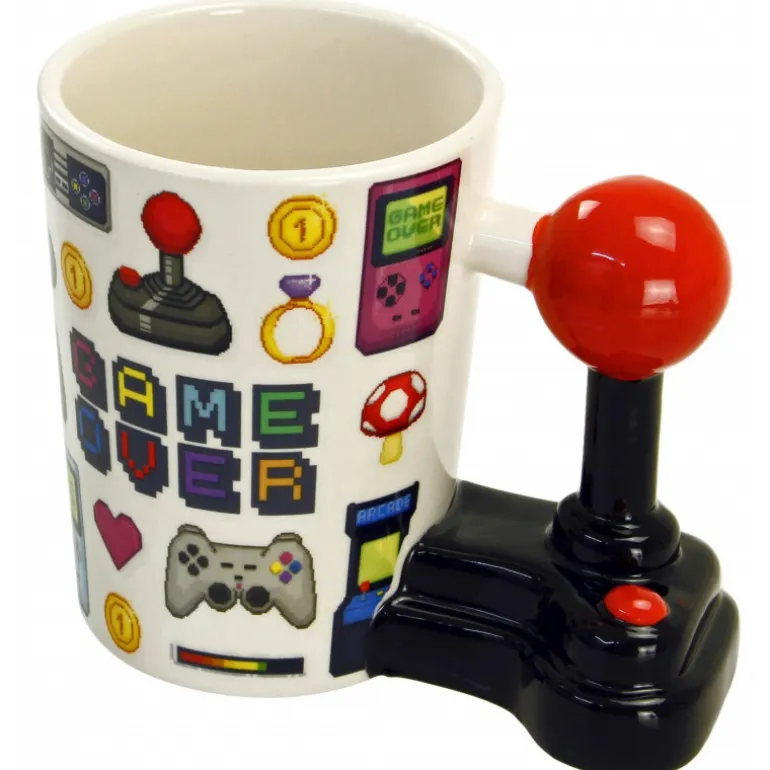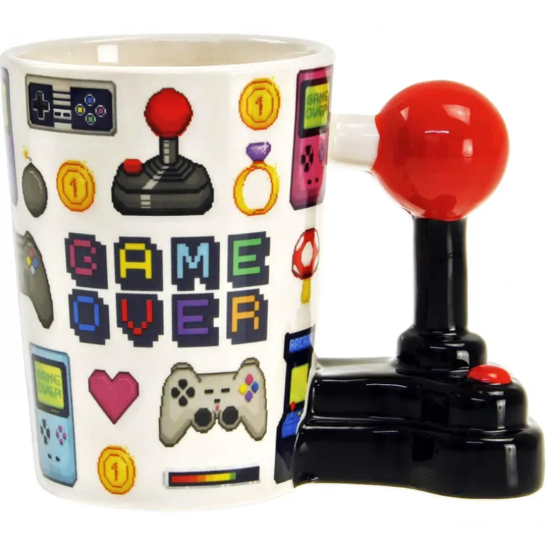 Y es esta taza tiene un diseño espectacular, que en primer lugar destaca por su asa, y es que tiene la forma de uno de esos clásicos joystick que tanto se veían en los 80 en las juegos arcade. Y no te pierdas los dibujos serigrafiados en la taza en sí misma, en los que vemos desde el típico Game Over, con sus píxeles y todo, hasta el mando de consolas tan emblemáticas como la Super Nintendo o la Play Station.