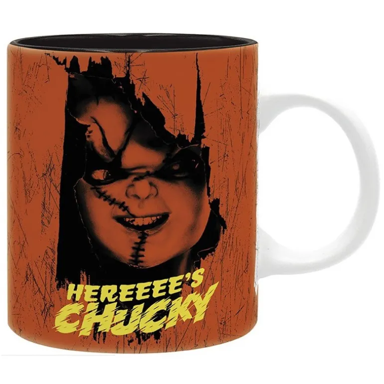 Su diseño es realmente espectacular, porque es un homenaje no solo a Chucky, sino también a esa mítica escena de El Resplandor en la que su protagonista aparece por el agujero de la puerta diciendo «Here’s Johnny», solo que en este caso es Chucky al que vemos aparecer. Además la taza está pintada de negro por dentro, lo que le da un aire realmente elegante.