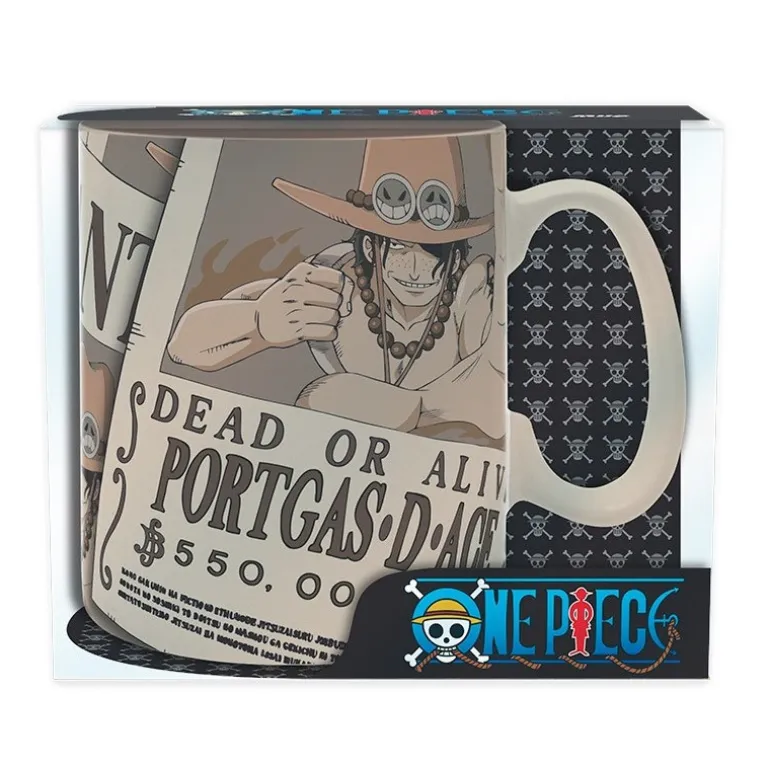Es una taza oficial licenciada por la productora de la original y divertida serie de anime One Piece, protagonizada por ese mítico cartel «Se busca» (Wanted) en el que aparece Ace (Portgas D. Ace es su nombre completo), con esa mirada desafiante que le caracteriza y el sombrero de paja, claro. Una imagen icónica de esta serie tan genial, que aparece reproducida con los detalles y colores del dibujo original.