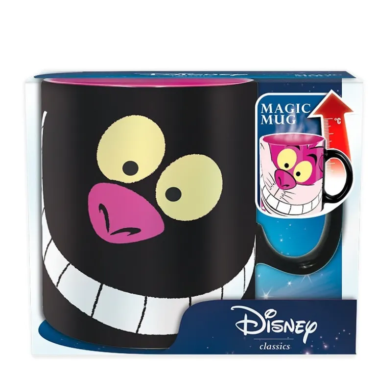 Se trata de una gran taza oficial de Disney, con casi medio litro de capacidad (460 ml), con un diseño que también abarca su interior y que es todo un homenaje a este gato siempre sonriente que es Cheshire. Un diseño que cambia con la temperatura: cuando la taza esta fría es de color negro y vemos solo intuimos a Cheshire, con sus ojos y perfecta sonrisa, pero cuando viertes líquido caliente en su interior, el dibujo se completa y vemos a Cheshire al completo, con ese color morado tan característico. Ojo, no es recomendable meter esta taza al lavavajillas ni al microondas.