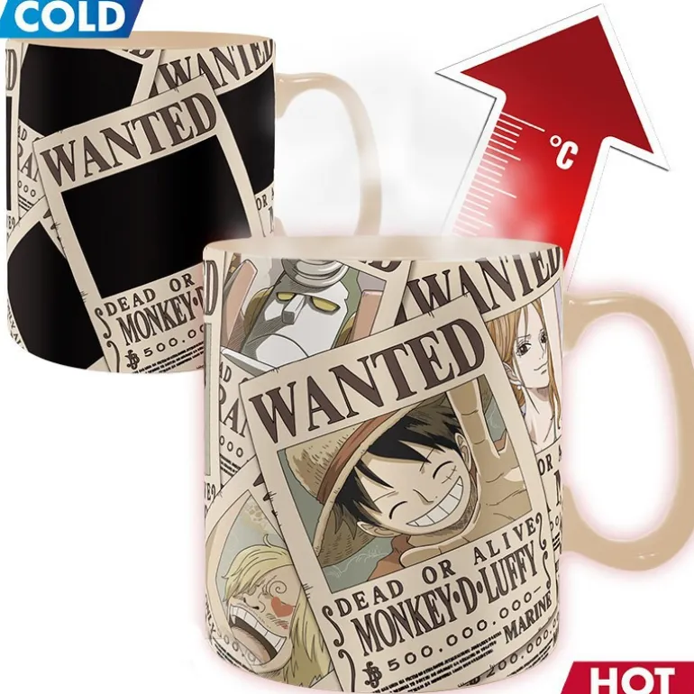 Es una taza oficial licenciada por la productora de la original y divertida serie de anime One Piece, protagonizada por varios carteles de «Se busca» que se llenan de color solo cuando le pones algo caliente dentro y puedes ver aparecer a Luffy y otros personajes.