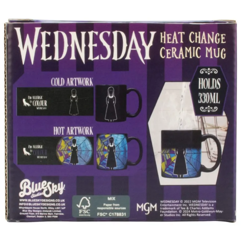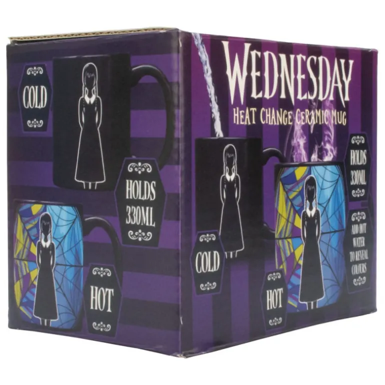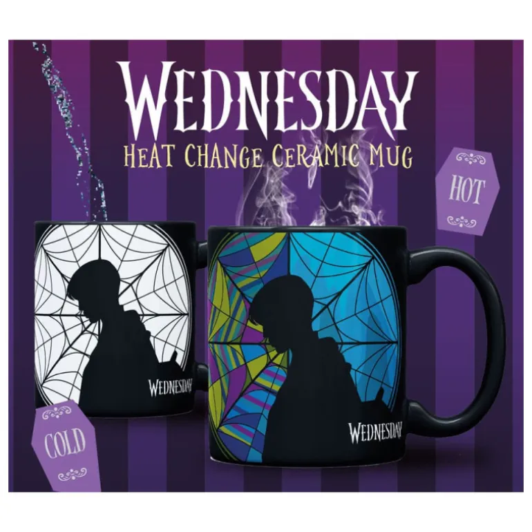 Con un diseño elegante, la taza muestra un fondo colorido y detallado de vitrales con una silueta en negro claramente definida de Miércoles. Al añadir agua caliente, el efecto térmico cobra vida revelando colores vibrantes que recuerdan a un vitral gótico, creando una obra de arte en cada uso.