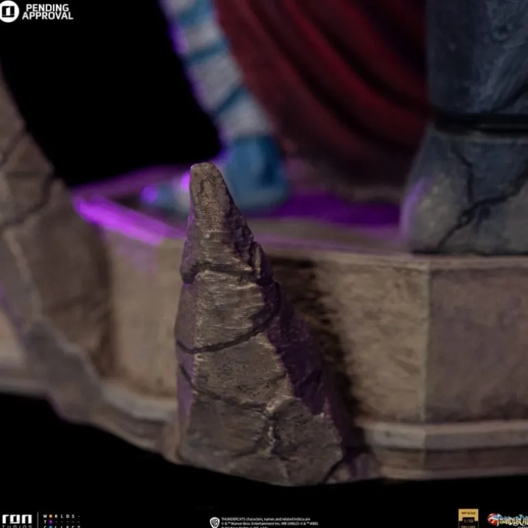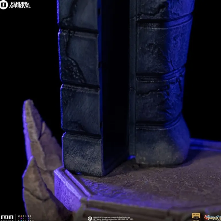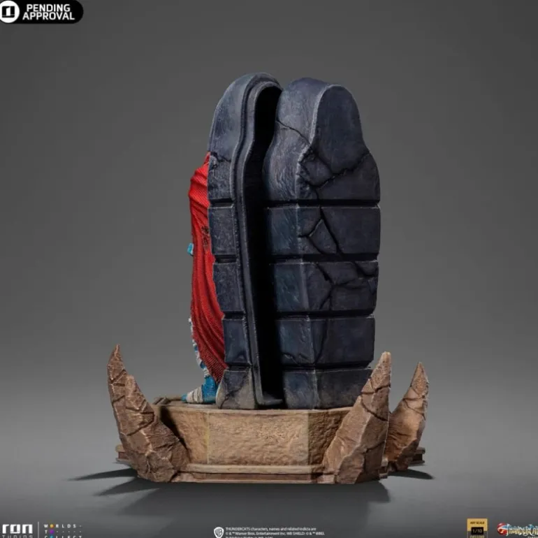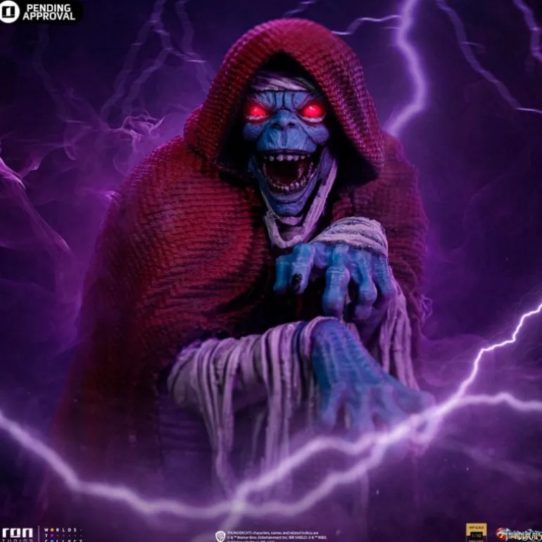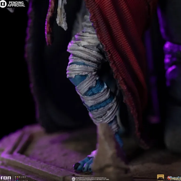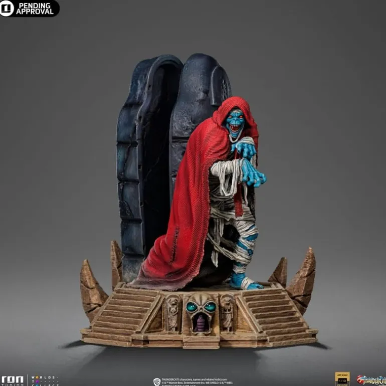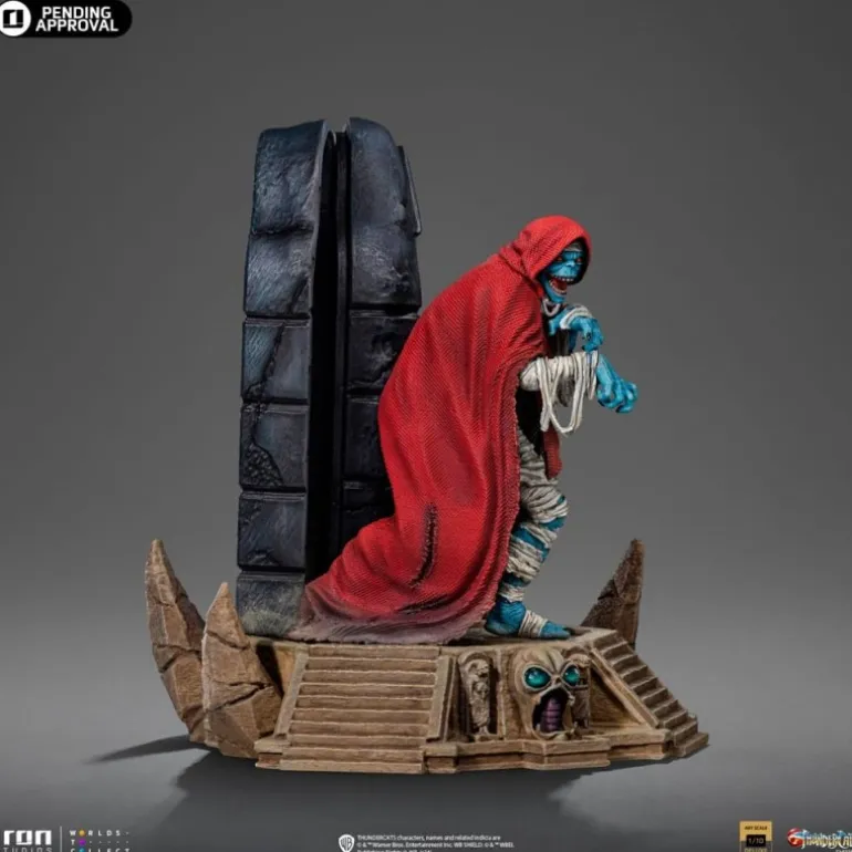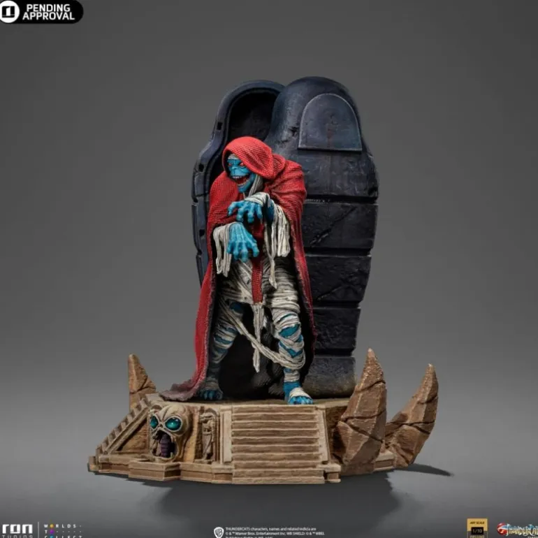La estatua muestra a Mumm-Ra envuelto en su característico manto rojo y situado frente a un inquietante sarcófago, destacando su piel azul y rasgos envejecidos, que evocan la esencia tenebrosa del personaje. La base esculpida añade un toque adicional con sus detalles tribales, complementando el conjunto.