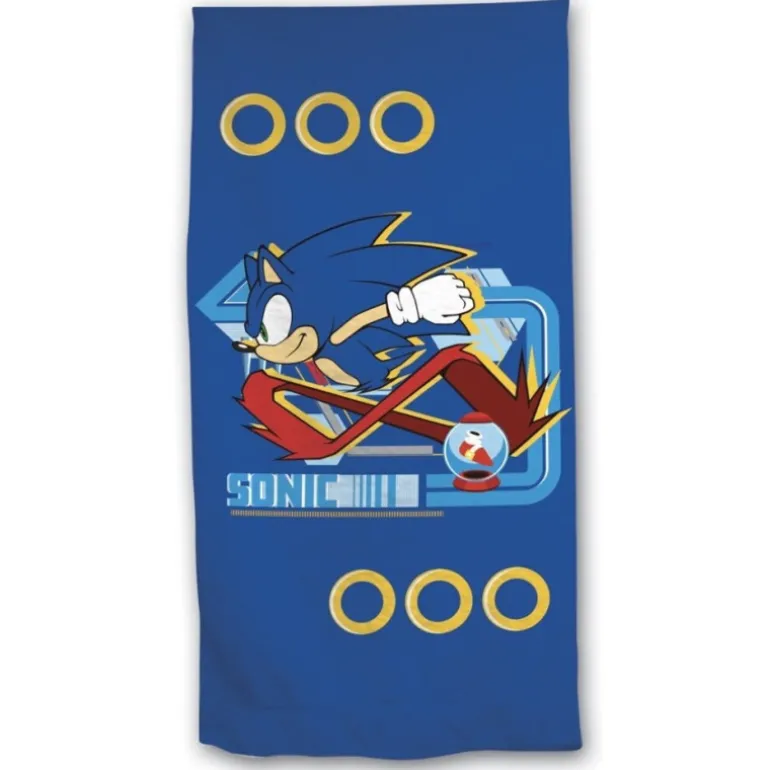 Es una enorme toalla que mide aproximadamente 140 x 70 cm. La toalla tiene una calidad extraordinaria tanto en materiales como en acabados, está realizada en poliéster con tacto aterciopelado. Y no te pierdas su diseño, con nuestro querido Sonic corriendo sin parar y con los anillos alrededor sobre un fondo también azul.