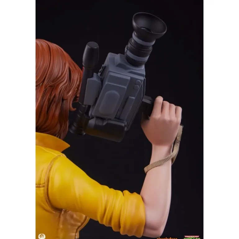 El modelado y la pintura manual destacan por su fidelidad y precisión, capturando la esencia del personaje con su icónico mono amarillo y su equipo de cámara en mano. Además, la base añade un toque dinámico, mostrando elementos de la saga para contextualizar todavía más a April.