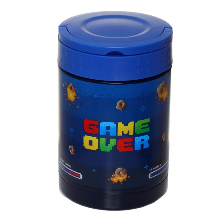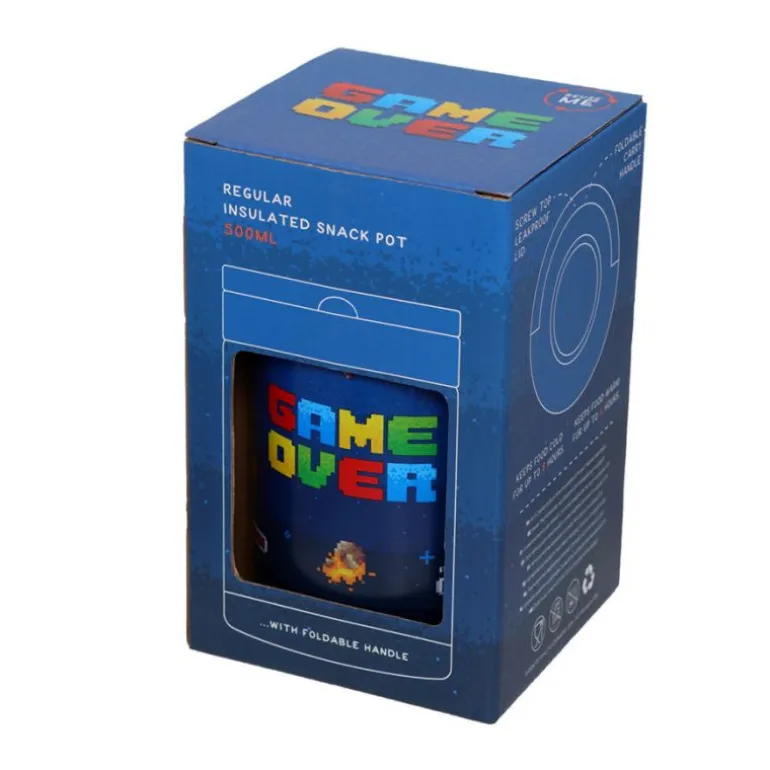 Pero si aún no te convences, no te pierdas su fantástico diseño, con ese Game Over que tan acostumbrados estamos a ver en los juegos de esas míticas máquinas arcade, y ese genuino estilo pixelado de los juegos clásicos. Está fabricado en plástico y acero inoxidable, cuenta con 500 ml de capacidad y mide unos 14 cm de alto.