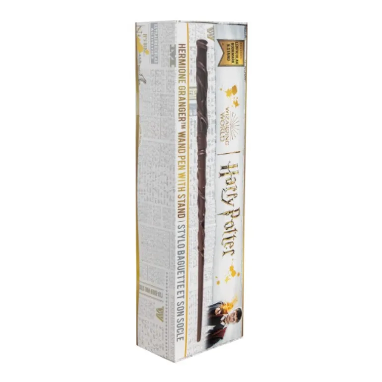 Se trata de una réplica que reproduce perfectamente la forma de la varita de la alumna más erudita de Hogwarts, Hermione, con todos sus detallitos de la varita original, solo que esta además es un bolígrafo para que apuntes tus conjuros favoritos. Viene con un marcapáginas lenticular con la imagen de la propia Hermione y también con un soporte expositor que lleva el escudo de Hogwarts reproducido en 3D con todos los detalles del original.