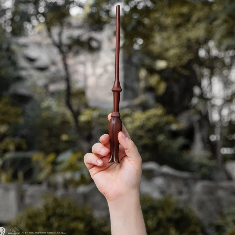 Se trata de una réplica que reproduce perfectamente la forma de la varita de esta excéntrica y encantadora alumna de Ravenclaw, con todos sus detallitos de la varita original, solo que esta además es un bolígrafo para que apuntes tus conjuros favoritos. Viene con un marcapáginas lenticular con la imagen de la propia Luna Lovegood y también con un soporte expositor que lleva el escudo de Hogwarts reproducido en 3D con todos los detalles del original.