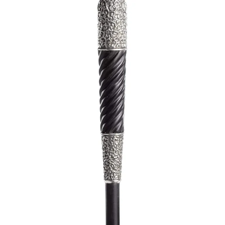 El acabado de la varita es meticuloso, mezclando tonos oscuros y claros que le confieren un aire misterioso y sofisticado. Viene presentada en una caja de lujo, que incluye un lazo de seda negro para asegurarse de que se mantenga en perfecto estado. La caja no solo protege la varita, sino que también realza su presentación como un objeto de alta gama.