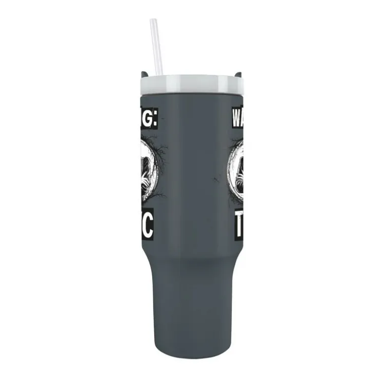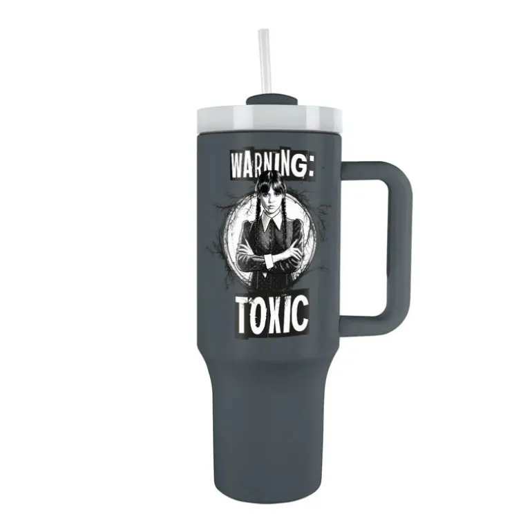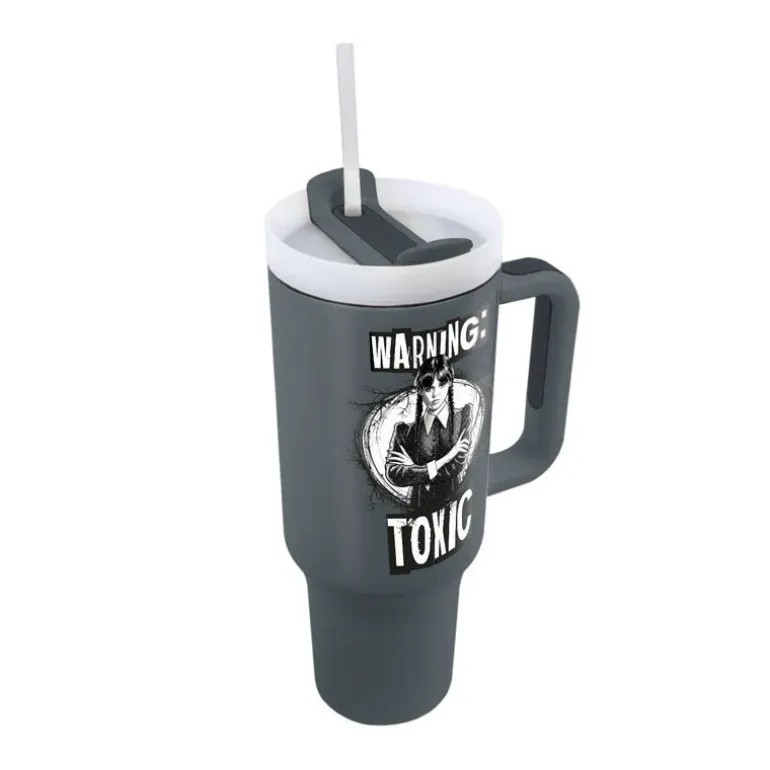 El diseño es llamativo y único, mostrando una imagen de Miércoles Addams con la frase «Warning: Toxic«, sobre un fondo negro que resalta por su elegancia. Equipado con tapa, pajita y asa, combina funcionalidad y estilo.