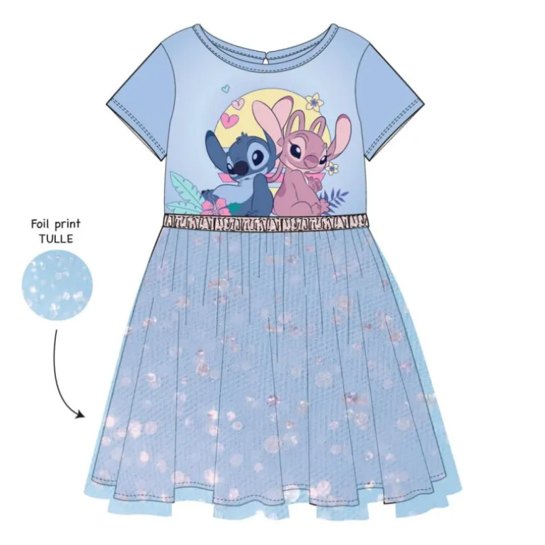 Confeccionado en un suave 100% poliéster, ofrece comodidad y durabilidad para el uso diario. El color azul claro del vestido junto con el estampado de Stitch y un personaje acompañante en tonos vibrantes, lo hacen visualmente atractivo y alegre.