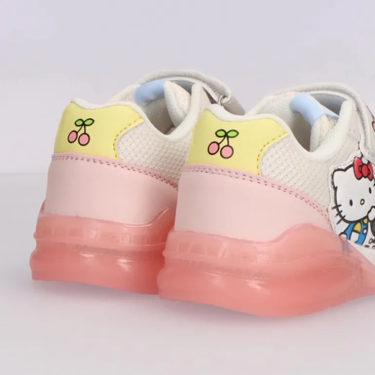Las zapatillas son predominantemente blancas con detalles rosados y amarillos, incluyendo divertidos gráficos de Hello Kitty y sus amigos. La característica más emocionante es la suela que se ilumina al caminar, haciendo que cada paso brille con color.