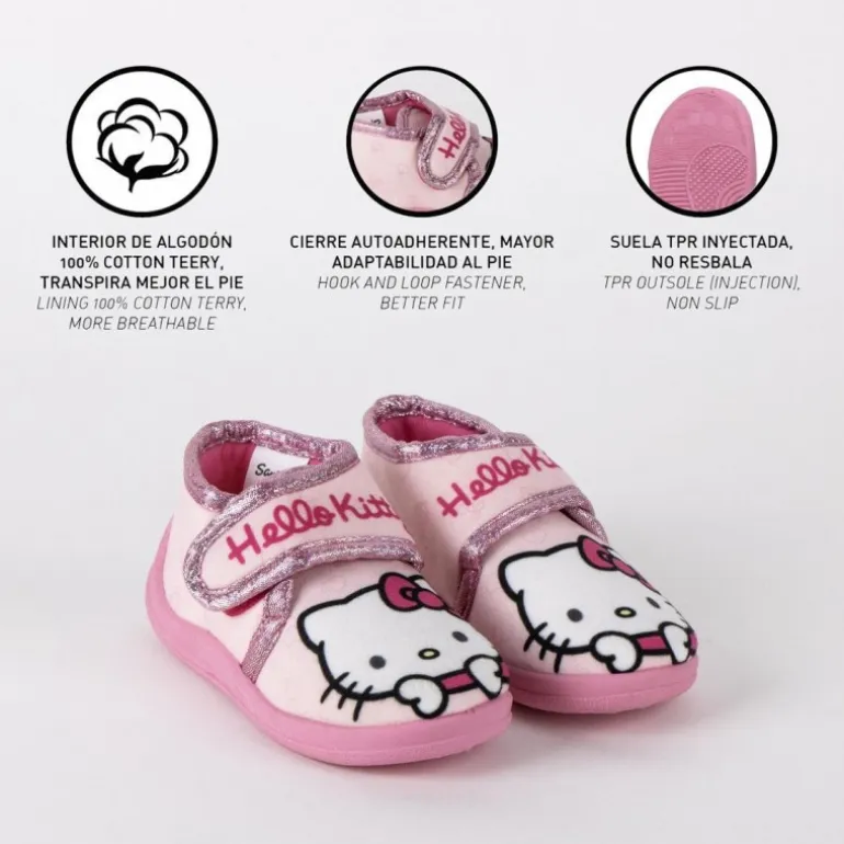Las zapatillas de casa Hello Kitty son ideales para los más pequeños. Diseñadas en un encantador color rosa con detalles brillantes, estas zapatillas de media bota destacan por su diseño de Hello Kitty en la parte frontal. Su cierre autoadherente asegura un ajuste perfecto, mientras que el interior de algodón garantiza la comodidad y transpirabilidad del pie. La suela de TPR inyectada proporciona antideslizamiento, asegurando que tus hijos caminen de manera segura por toda la casa. Fabricadas en polyester y disponibles en tallas T025-T030, son el complemento perfecto para los pequeños fans de Hello Kitty.
