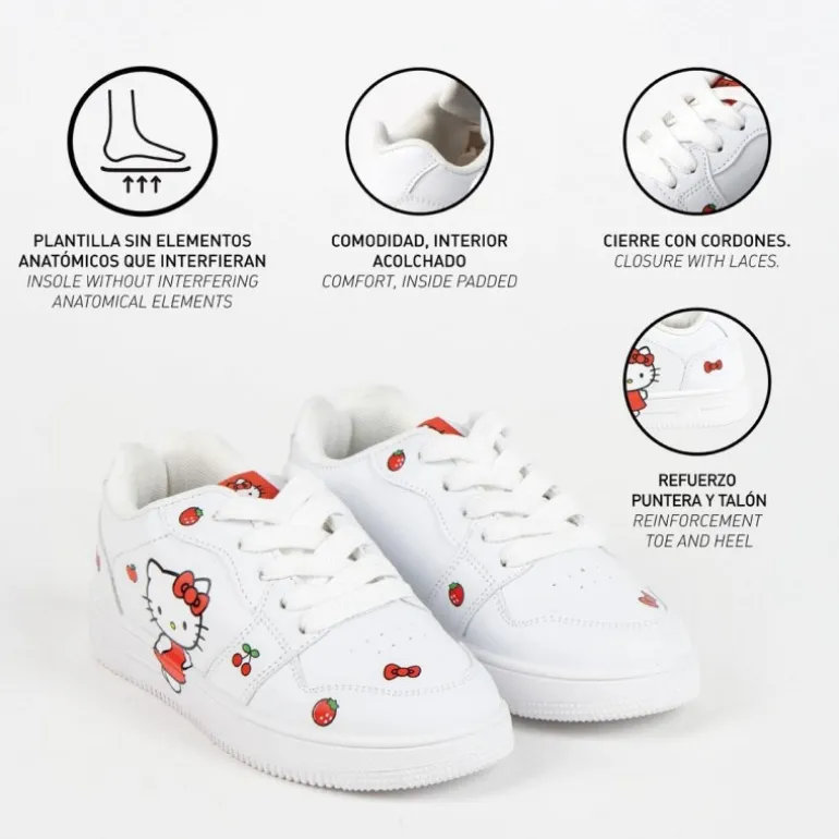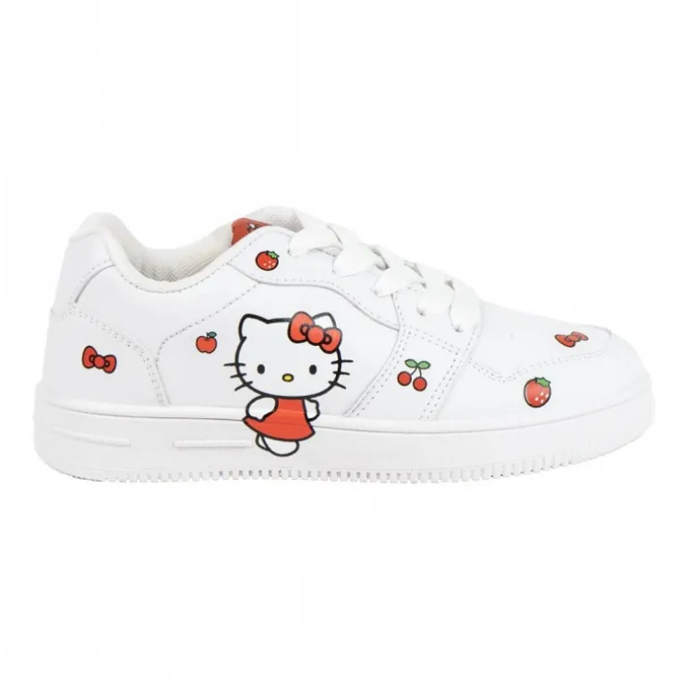 Estas zapatillas deportivas de Hello Kitty son el complemento ideal para las más pequeñas. Confeccionadas en PU, poliéster y PVC, ofrecen una durabilidad óptima y un diseño atractivo. Su estructura se caracteriza por un fondo blanco que resalta los detalles en rojo y los dibujos de Hello Kitty, ofreciendo un estilo único y divertido.